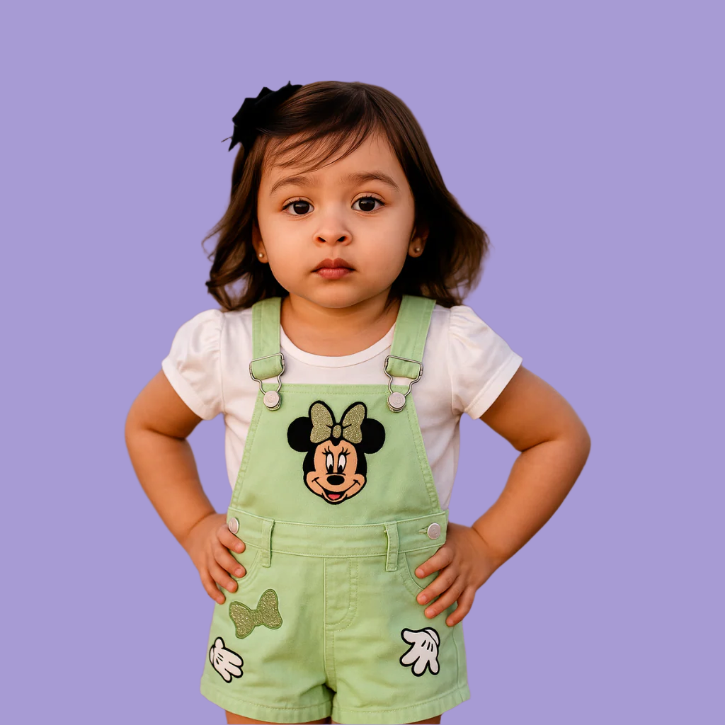 BabyChirp Girls Green Minnie Dungaree Shorts Set with White Cotton Top – 2-Piece Outfit (1–6 Years)