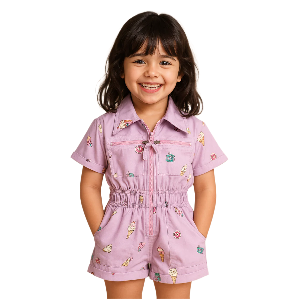 BabyChirp Girls Lavender Cotton Romper with Ice Cream & Donut Print – Zip-Front One-Piece with a Sling Bag Summer Outfit (1–7 Years)